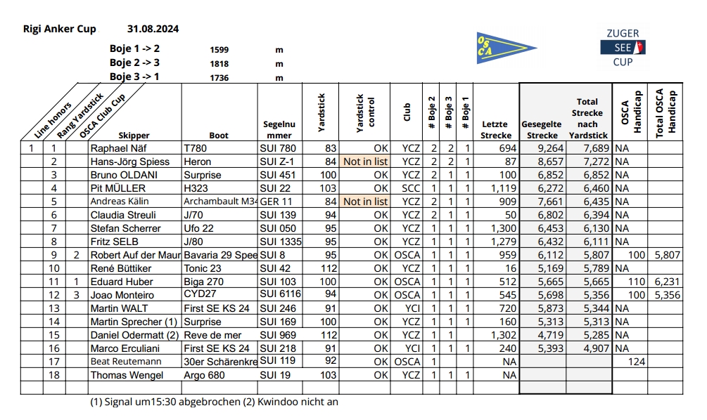 Die Wettfahrtleitung des ausrichtenden Obersee Segel Club Arth (OSCA) hatte eine Dreieckskurs ausgelegt, der innert 2.5 Stunden so oft wie möglich zu umsegeln war. Die dabei zurückgelegte Distanz wurde per Tracking-App Kwindoo ermittelt und mit den Yardstickzahlen der Boote verrechnet.